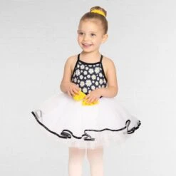 Little ones look resplendent in this ballet dress from 1st Position with dainty, daisy print bodice, a fixed bow and four layers of net.
