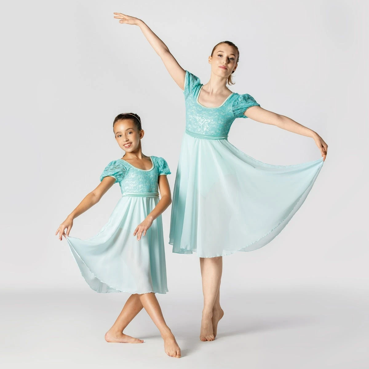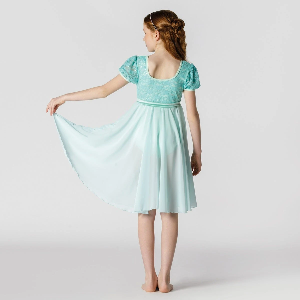 Incarnez l`élégance lyrique dans cette superbe robe à corsage en dentelle de 1st Position, dotée de manches bouffantes, d`une jupe fluide en flûte et d`une ceinture en velours.