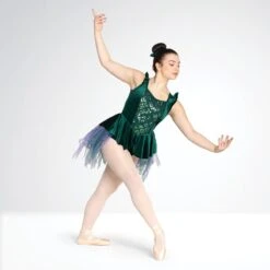 Offrez une performance aussi saisissante que cette robe 1st Position de ballet à panneaux de paillettes aux couleurs vert paon accrocheuses! Parfait pour le ballet expressif et les spectacles thématiques.