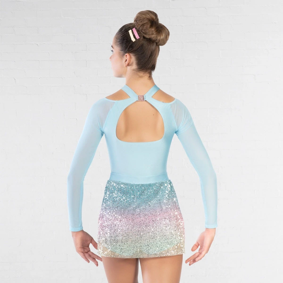Mettez en valeur votre talent et votre dynamisme dans cette saisissante robe lyrique à jupe à paillettes ombrées de 1st Position. Les manches en maille, les découpes et l`encolure haute offrent un style sophistiqué.