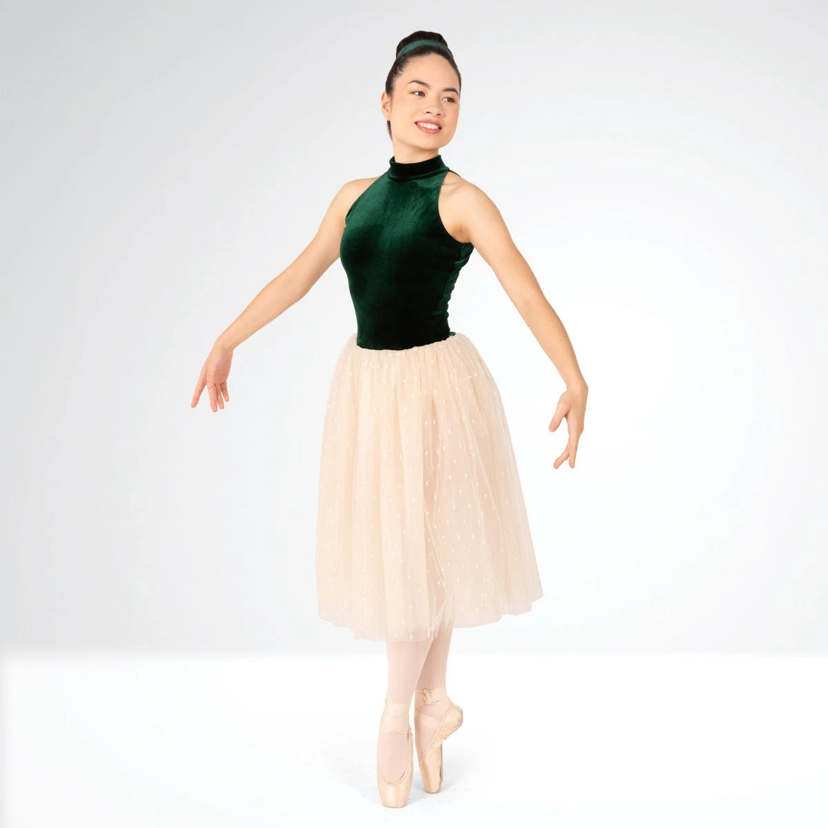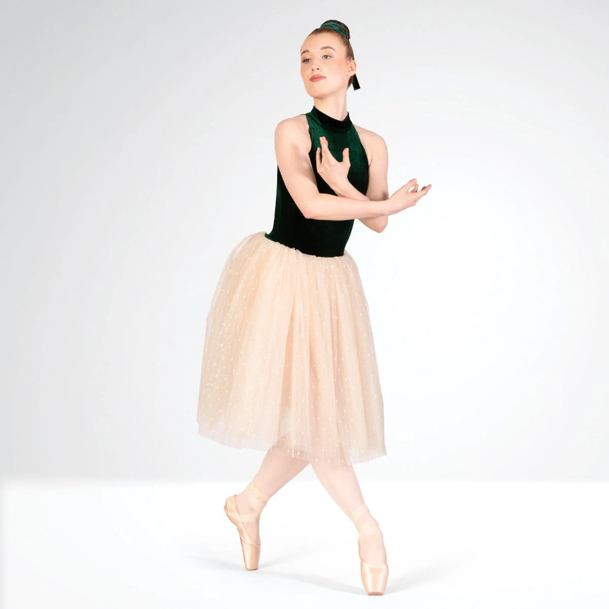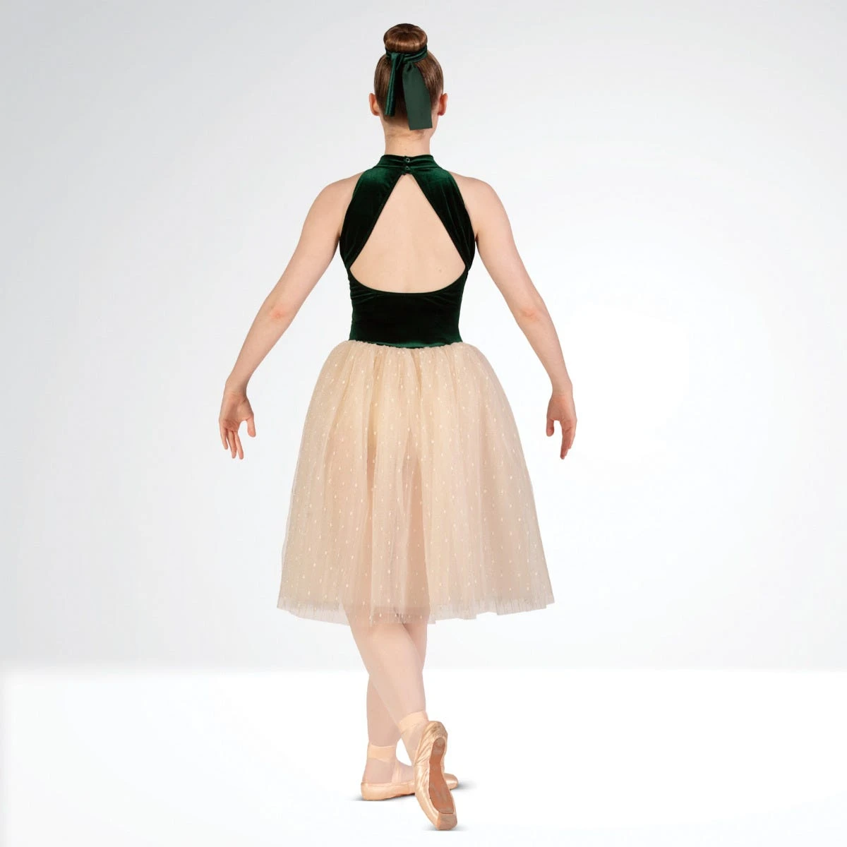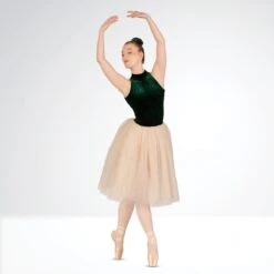 La robe de ballet majestueuse 1st Position combine un justaucorps en velours vert forêt et une jupe romantique dorée. Parfaite pour le ballet et les spectacles sur le thème de la forêt.