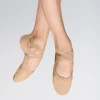 Demi pointes à semelle fendue en toile avec un élastique à la place du lien et du cordon – l`élastique s`adapte au pied et réduit la pression sur le tendon d`Achille et sur la surface dorsale du pied lorsqu`il touche le sol.