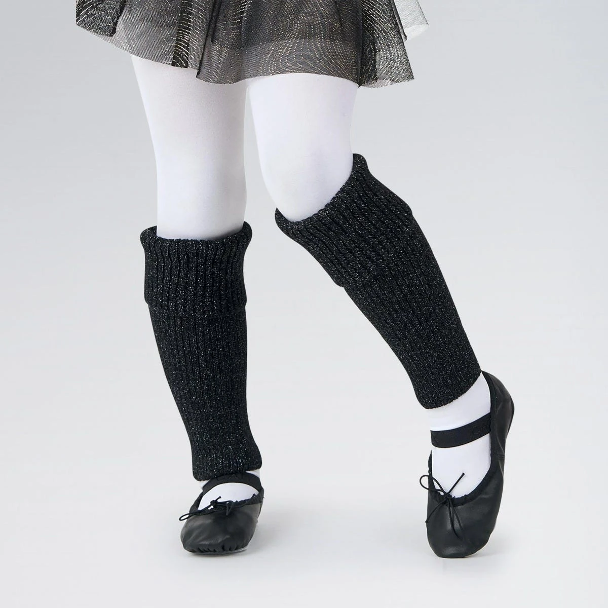 Keep tiny dancers warm during the colder months! These soft and plush legwarmers are knit with a metallic liquorice threading to offer a pop of glamour for even the smallest of dancers. Elastic is knit into the leg and bottom of the foot for added security.