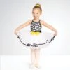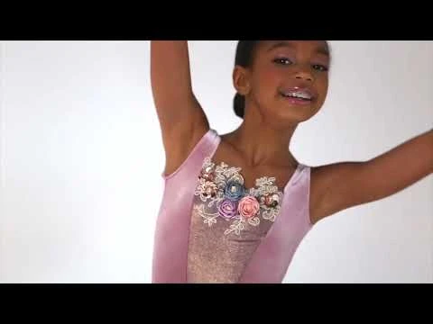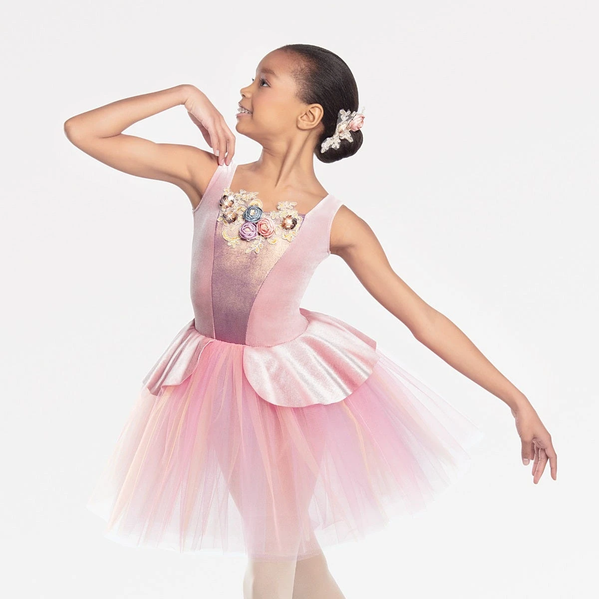 Justaucorps en velours extensible rose avec inserts en Ă©lasthanne irisĂ© devant et dos,  et un appliquĂ© floral cousu sur le dĂ©colletĂ©. Le dos du corsage est ornĂ© d`un laçage de ruban en satin. Jupe tutu intĂ©grĂ©e composĂ©e de six Ă©paisseurs de tulle de couleurs alternĂ©es sous une basque en velours assorti. Â