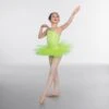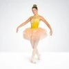 Justaucorps en velours extensible appliqué croquet et motif floraux avec empiÚcement poitrine et manches en élasthanne bordés d`un ruban en dentelle. Le tutu est composé de plusieurs épaisseurs de de tulle sous un premier rang en organdi couvert d`un jupe en velours extensible appliqué de rubans, croquet et motifs floraux.