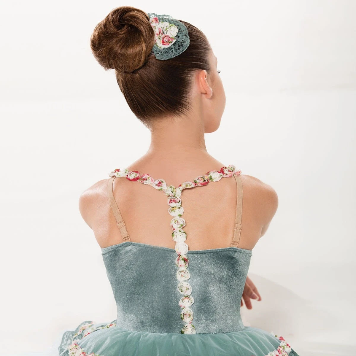Justaucorps en velours extensible vert avec bretelles couleur chair ajustables. Frise fleurie cousue partant de la taille, se poursuivant sur le dĂ©colletĂ© puis le dos jusqu`Ă la ceinture. Tutu Degas intĂ©grĂ©, composĂ© de plusieurs Ă©paisseurs de tulle sous une Ă©paisseur d`organdi ornĂ©e de dentelle et de frise fleurie assortie.         Â