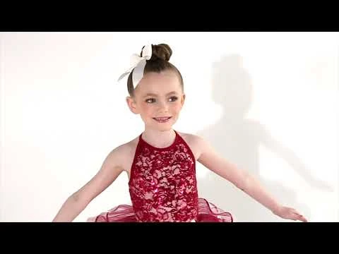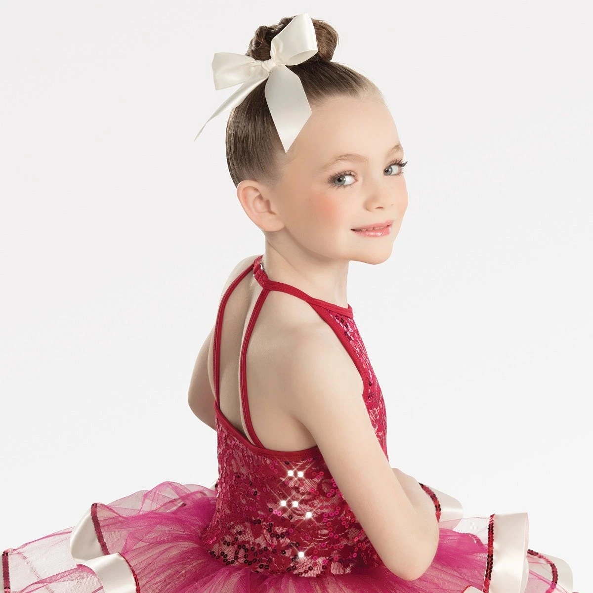 Justaucorps en Ă©lasthanne avec corsage recouvert de dentelle Ă sequins florale extensible. Le corsage et les bretelles sont ourlĂ©s d`elasthanne, un nĆud en ruban de satin est cousu Ă la taille et la fermeture se fait par crochets au niveau du cou. La jupe attachĂ©e se compose de trois couches de tulle sous deux couches de tulle, les deux couches supĂ©rieures Ă©tant bordĂ©es de ruban de satin et de sequins.