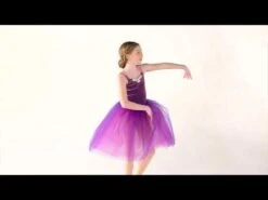 Justaucorps en élasthanne avec corsage en velours extensible. Empiècement en voile chair dans le dos, et ornement bijou sur le haut de la poitrine. La jupe est constituée de six couches de tulle.