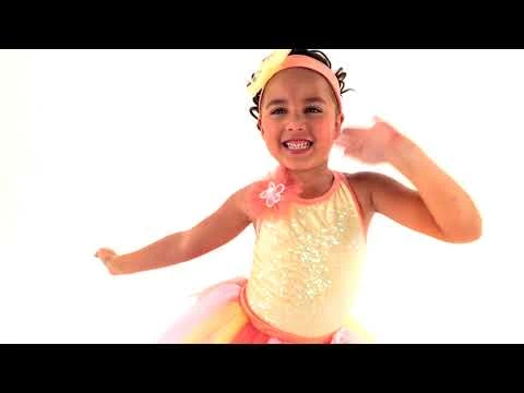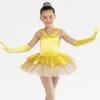 Justaucorps en élasthanne jaune orné de sequins irisés avec doubles bretelles croisées dans le dos, fleurs cousues sur l`épaule et sur la ceinture.