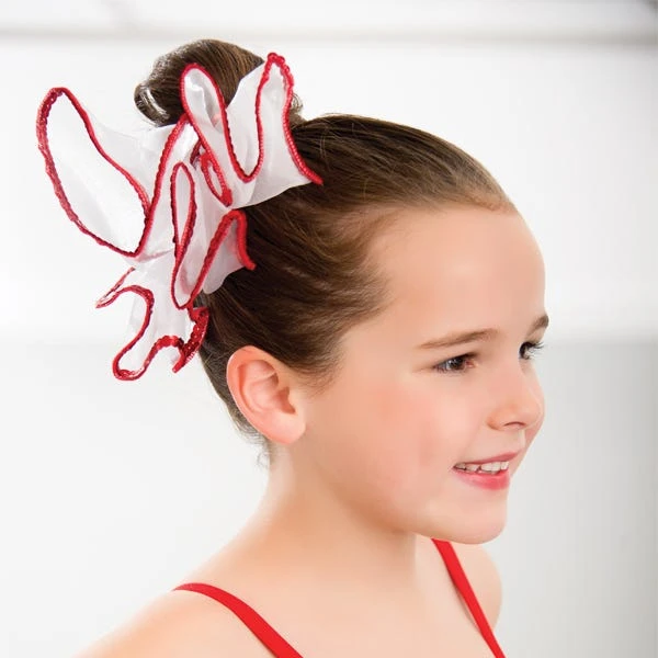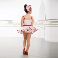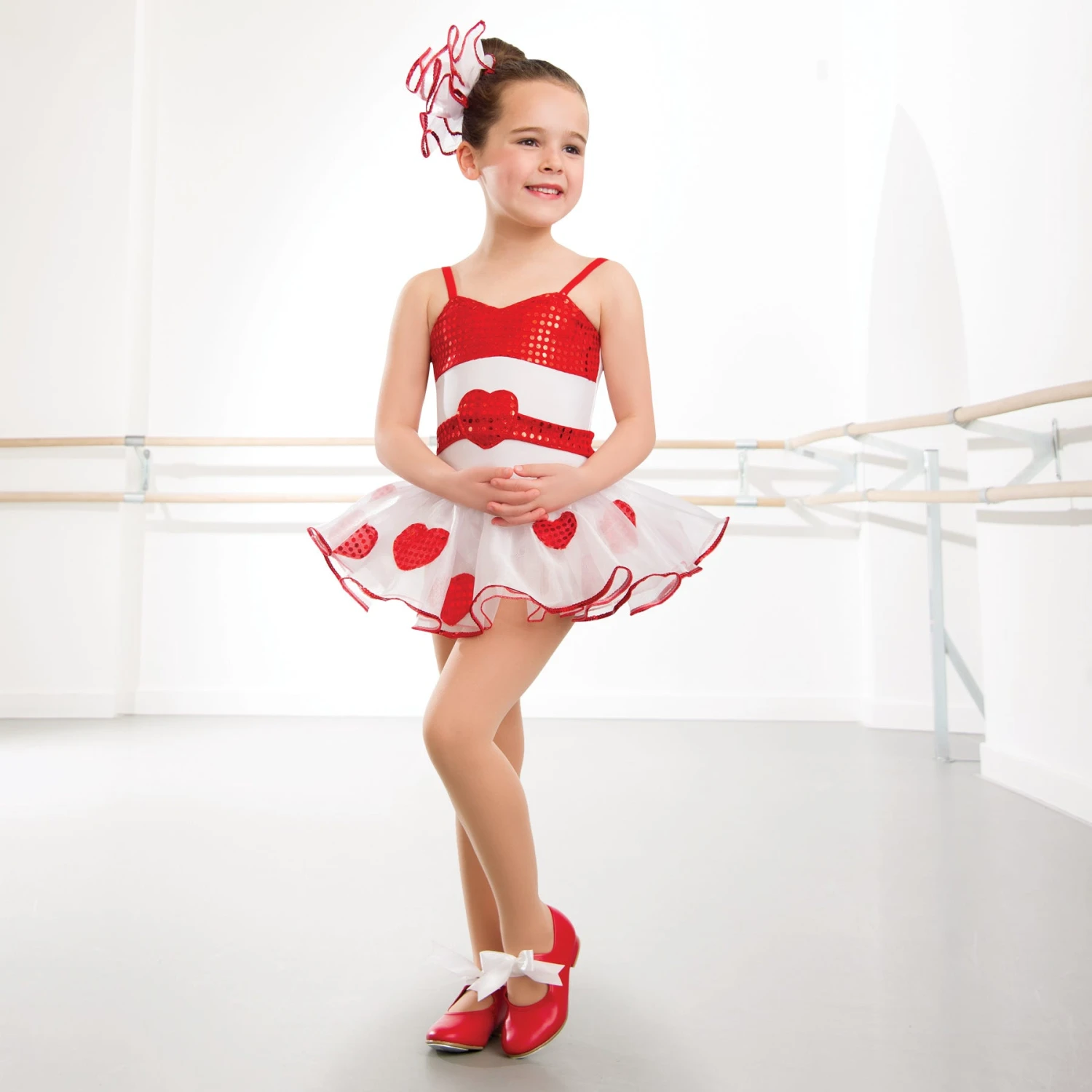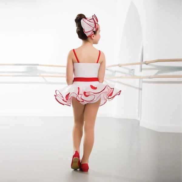 * Le justaucorps blanc a un détail de tissu rouge à paillettes sur le devant avec des bretelles rouges et une bande attachée autour du corsage avec un cœur rouge au centre. La jupe attachée a 2 couches d`organza raidis bordées de paillettes rouges et décorées de coeurs en tissu à paillettes rouges. Il y a une décoration de cheveux assortie avec une barrette pour compléter le look.